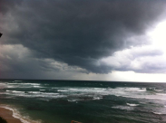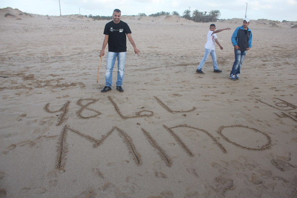 الشاب وسام الزبارقة يكتب اسم موقع يافا 48 على شاطئ البحر