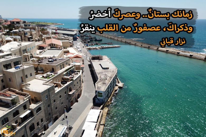 ما زال موقع يافا 48 مستمر معكم في نشر مختارات من أجمل القصائد، مع مقاطع جوية رائعة لمدينة يافا، وهذه المرة نستمع لقصيدة "زمانك بستانٌ.. وعصركَ أخضرُ" للشاعر الكبير نزار قباني، والتي يقول فيها: