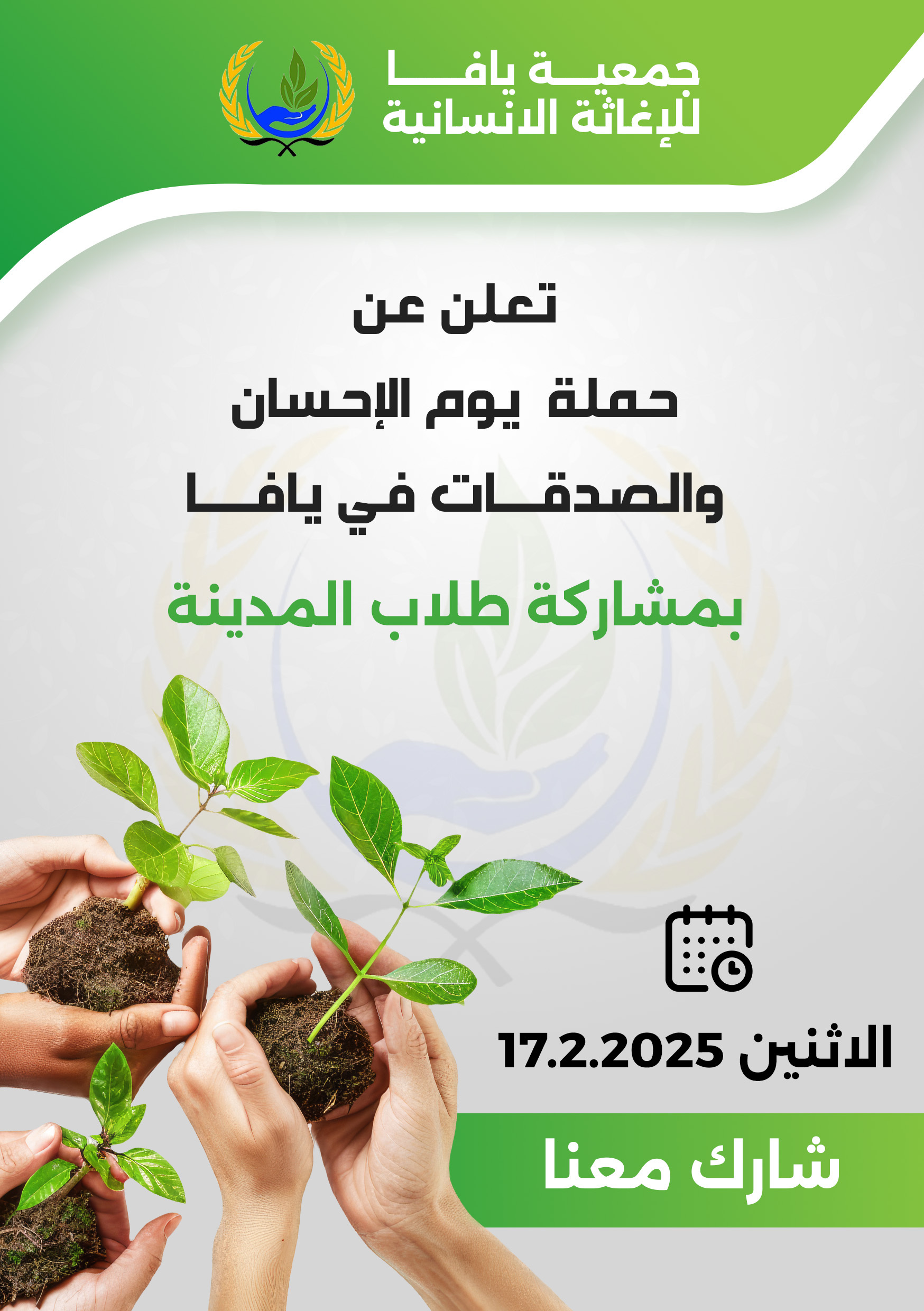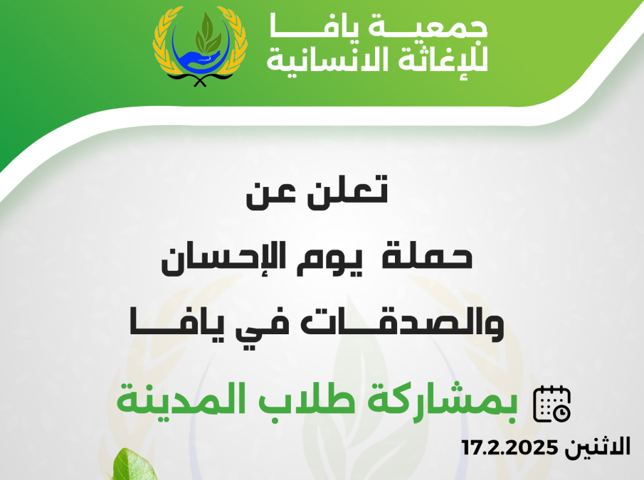 أعلنت جمعية يافا للإغاثة الإنسانية أنها تنوي إطلاق حملة لجمع التبرعات من أهالي المدينة وذلك بتاريخ 17.2.2025 تحت عنوان "يوم الإحسان والصدقات"، والتي تُنظمها الجمعية في كل عام، حيث سيتم في هذا اليوم التجوّل في شوارع المدينة والتوجه الى البيوت والمحلات التجارية بمشاركة أعضاء الجمعية ومتطوعين من طلاب المدارس لحث الأهالي على التبرّع لصالح فقراء المدينة والعائلات المستورة.