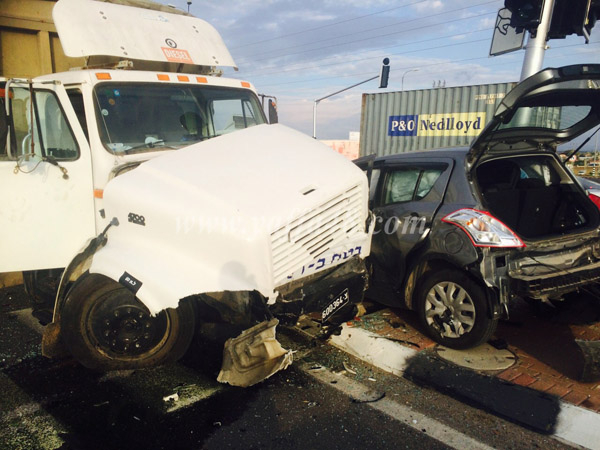 بالصور: 4 إصابات بحادث طرق مروّع بين شاحنة ومركبتين وسط مدينة الرملة