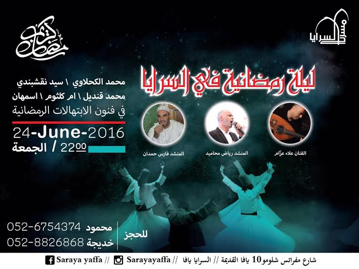 ينظم مسرح السرايا العربي في يافا ليلة ابتهالات رمضانية بمشاركة الفنان علاء عزام وفرقته وكل من المنشدين: الشيخ رياض محاميد، والشيخ فارس حمدان. وذلك يوم الجمعة القريب 24.6 في الساعة العاشرة مساءً.