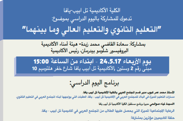 تُنظم الكلية الأكاديمية تل ابيب يافا يوم غدٍ الأربعاء يوماً دراسياً بعنوان "التعليم الثانوي والتعليم العالي وما بينهما"، وذلك بمشاركة سعادة القاضي محمد زبدة - هيئة أمناء الكلية، والبروفيسور شلومو بيدرمان رئيس الكلية، وذلك ابتداءً من الساعة 15:00 في مبنى رقم 2 "وستون".