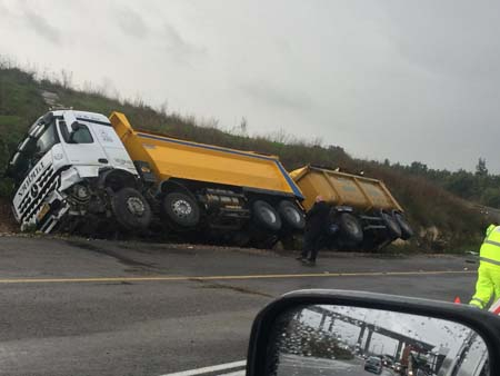 بالصور : تحطم سيارة وانقلاب شاحنة قرب مدينة اللد