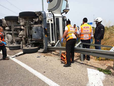 فيديو: اصابة متوسطة لسائق بانقلاب شاحنة قرب مدينة الرملة