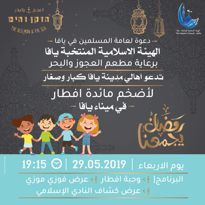 تدعو بهذا الهيئة الاسلامية المنتخبة أهالي مدينة يافا الى المشاركة في اضخم مائدة افطار رمضانية في ميناء يافا، وذلك تحت رعاية مطعم العجوز والبحر.