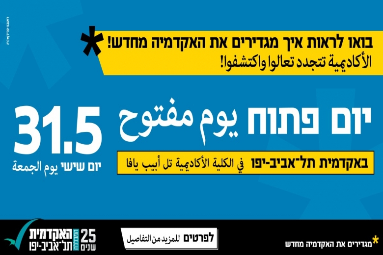 تدعوكم الكلية الأكاديمية تل أبيب يافا لحضور اليوم المفتوح الذي سيُقام يوم الجمعة 31.05.2019 في تمام الساعة 9:00 صباحاً.