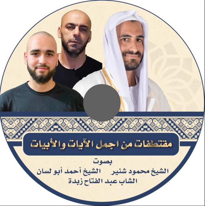 سيتم خلال صلاة عيد الفطر السعيد في العراء "متنزه العجمي" توزيع مئات النسخ على المصلين من "مقتطفات من أجل الآيات والأبيات"، وذلك بصوت الشيخ محمود شنير والشيخ أحمد ابو لسان، والشاب عبد الفتاح زبدة.