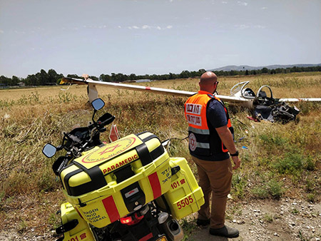 وأفاد الناطق بلسان نجمة داوود الحمراء في بيان لوسائل الإعلام : " تم تلقي تقرير في مركز نجمة داوود الحمراء يفيد بتحطم طائرة خفيفة أثناء عملية الهبوط بالقرب من مفرق مجيدو شمالاً، وقد وصلت الطواقم الطبية لمكان الحادث، وقامت بتقديم الإسعافات الأولية لشخصين مصابين، أحدهما "55 عاماً" وإصابته حرجة والآخر في الخمسين وإصابته متوسطة، وتم استدعاء مروحية تابعة لنجمة داوود لإجلاء المصابين للمشفى لاستكمال العلاج".