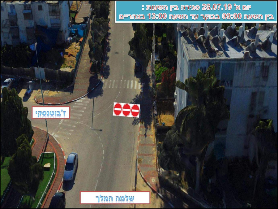 من الساعة 9 صباحاً وحتى الساعة 1 ظهراً، سيتم اغلاق الطريق من مفرق جابوتنسكي وشلومو هميلخ وكيكار ريمون، مع فتح مسار واحد فقط أمام حركة السير، ولن يسمح للسيارات المرور من شارع شلومو هميلخ من الشمال وحتى الجنوب، وذلك حتى دوار ريمون.