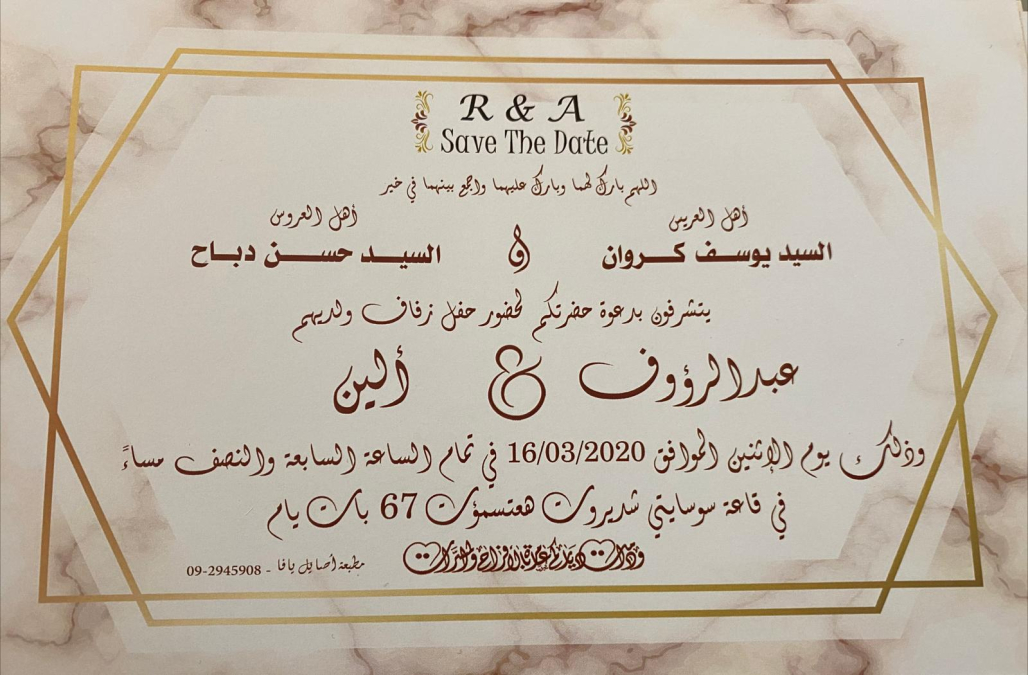 أعلن السيد يوسف كروان والسيد حسن دباح عن الغاء حفل زفاف "عبد الرؤوف وألين" الذي كان من المفترض أن يُقام يوم الاثنين المقبل 16.3.2020 في قاعة سوسايتي.