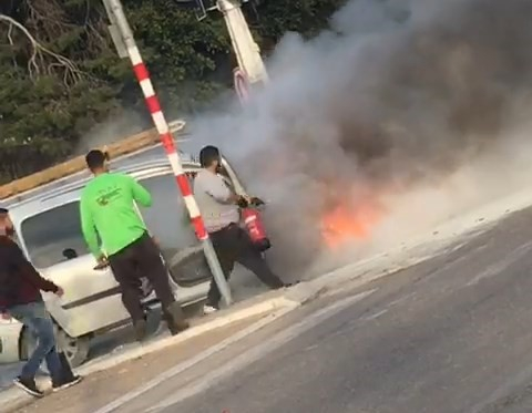 وقد قام عدد من الشبان في المكان باخماد الحريق قبل انتشاره على باقي اجزاء المركبة.
