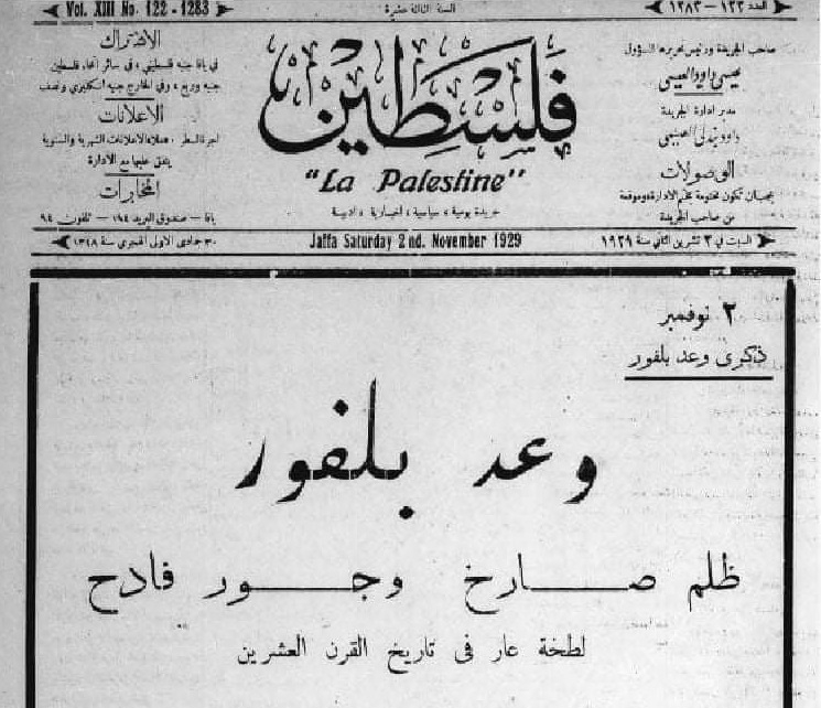 حصل موقع يافا 48 على صفحة من صحيفة فلسطين الصادرة في مدينة يافا بتاريخ 2 نوفمبر من عام 1929، والذي يُصادف الذكرى السنوية لوعد بلفور المشؤوم، حيث كتبت الصحيفة في صفحتها الأولى آنذاك "وعد بلفور .. ظلم صارخ وجور فادح" لطخة عار في تاريخ القرن العشرين، فعلى بريطانيا العظمى أن تمحو هذا العار الذي يضر بمصلحتها ويلوث شرفها".