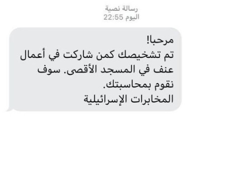 وجاء في الرسائل: (مرحبا! تم تشخيصك كمن شاركت في أعمال عنف في المسجد الأقصى. سوف نقوم بمحاسبتك. المخابرات الإسرائيلية).