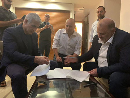 قالت مصادر مقرّبة من الاجتماع الثلاثي الذي يشارك فيه نفتالي بينت ويائير لبيد ومنصور عباس، أن رئيس القائمة الموّحدة عضو الكنيست منصور عباس وقّع على وثيقة تُتيح لرئيس حزب "يش عتيد عضو الكنيست يائير لبيد أن يُبلغ رئيس الدولة رؤوفين ريفلين عن نجاحه بتشكيل الحكومة.
