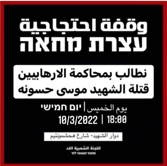 الخميس: وقفة احتجاجية باللد للمطالبة بمحاسبة قتلة الشهيد موسى حسونة