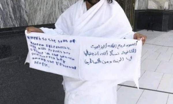 وفي الفيديو ومدته لا تتجاوز 20 ثانية، ظهر الرجل بملابس الإحرام حاملا لافتة بيضاء كتب عليها بخط اليد: "العمرة لروح الملكة إليزابيث الثانية، نسأل الله أن يتقبّلها في الجنّة ومن الصالحين".