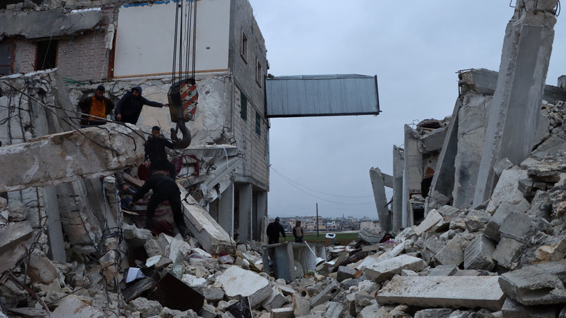 وتواصل طواقم الإنقاذ وفرق المتطوعين، جهودها لاستخراج جثث عالقين بعد بدء فقدان الأمل باستخراج أحياء من تحت ركام آلاف المباني المهدومة في الشمال السوري (مناطق خارج سيطرة النظام السوري).