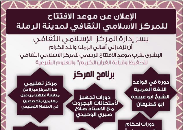 يسر ادارة المركز الاسلامي الثقافي في مدينة الرملة أن تزف لأهالي الرملة واللد الكرام البشرى باقتراب موعد الافتتاح الرسمي للمركز الاسلامي الثقافي لتحفيظ القرآن الكريم والعلوم الشرعية، وذلك تحت رعاية لجنة الامناء لمدينة الرملة.