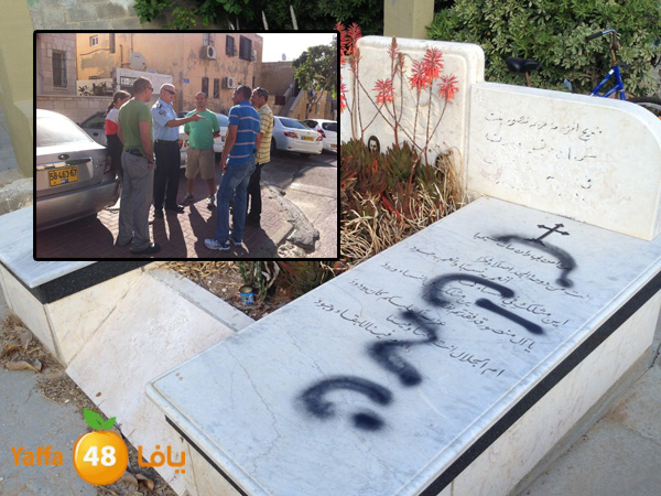 من الناطقة بلسان الشرطة لوبا السمري- صباح اليوم الخميس , تم الكشف على انة وفي خلال ساعات الليلة الماضية في مدينة يافا ,شارع "بات يام" بالمقبرة الارثوذكسية ,تم الحاق اضرار بعدد من القبور , الخط على عدد منها كتابات قومية مسيئة مختلفة بالعبرية تضمنت ما معناه بالعربية " انتقام- נקמה " "تدفيع الثمن-תג מחיר " اضافة لرسم شعار نجمة داوود على عدد من القبور .