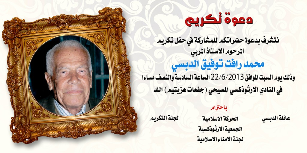 وصل موقع يافا 48 دعوة للمشاركة في حفل تأبين المرحوم الأستاذ المربي محمد رأفت توفيق الدبسي والتي ستُقام يوم السبت القادم 22-6-2013 الساعة السادسة والنصف في النادي الارثوذكسي بمدينة اللد.