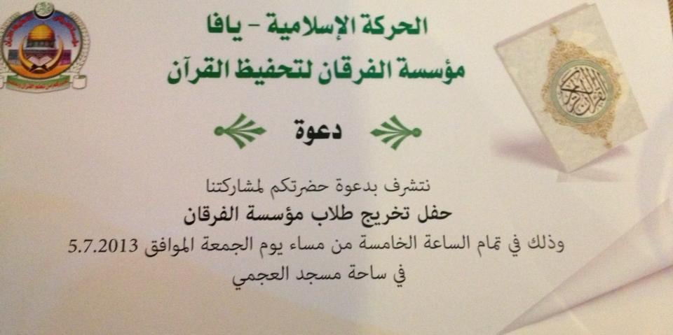 الجمعة: دعوة للمشاركة في حفل تخريج طلاب مؤسسة الفرقان لتحفيظ القرآن الكريم بيافا