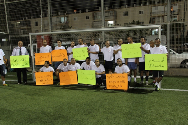 ورفع المشاركون في الوقفة لافتات من بينها "اولاد يافا اولى بملاعبها، لن نساوم بملاعبنا، الرياضة حق للجميع، إغلاق ملعب يساوي فتح سجن، لا للخصخصة،