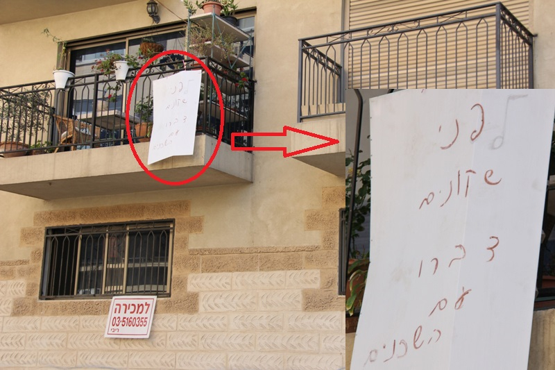 لاحظ مراسل موقع يافا 48 لافتة قد علت شرفة أحد البنايات السكنية في منطقة النزهة والتي كُتب عليها عبارة "قبل ان تشتري اسأل الجيران"، وعلى ما يبدو فإنها جاءت بعد تذمر من قبل أحد السكان في المبنى لسوء الجوار.