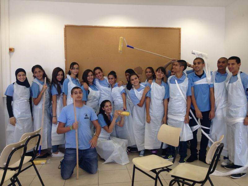 بالصور: طلاب الصف الحادي عشر في مدرسة اجيال يقومون بحملة تنظيف ودهان داخل الصفوف