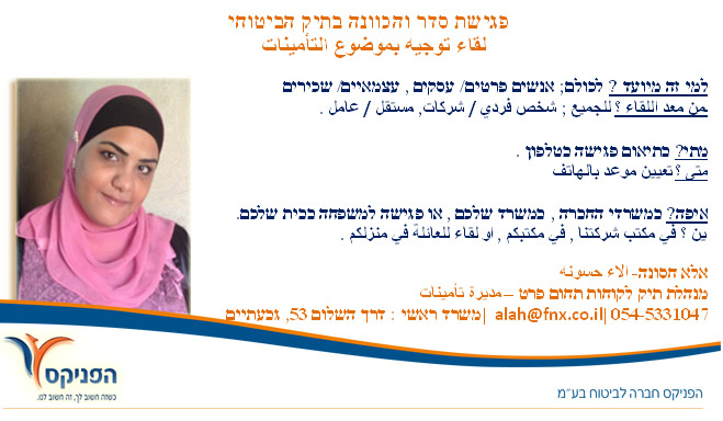 تريد لقاء مجاني وبدون التزام يرجى الاتصال بالاء حسونه – مديرة تأمينات لرقم 0545331047 او ارسال ايميل Alah@fnx.co.il