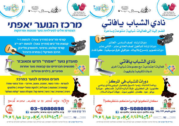 وصل موقع يافا 48 دعوة صادرة عن نادي الشبيبة "يافاتي" يدعو من خلالها الشباب في المدينة للاشتراك في الدورات المتعددة والمتنوعة التي يقدمها، ومن بينها (دورات ارشاد لصف السادس - العاشر، دورات ارشاد للبالغين لصف الحادي عشر - الثاني عشر، دورات تصوير ومسرح بلايباك، جرافيتي، فرق موسيقية، كرة قدم، وغيرها).