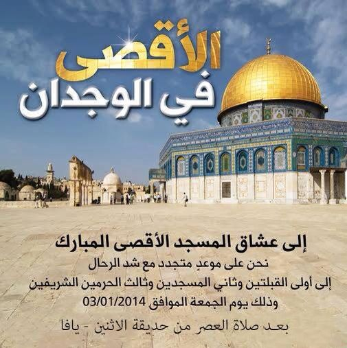 وصل موقع يافا 48 دعوة صادرة عن الوحدة الادارية في الحركة الاسلامية بمنطقة المركز تدعو من خلالها أهالي مدينة يافا للمشاركة في شد الرحال للمسجد الأقصى المبارك، والمشاركة في اللقاء الشهري الذي يُقام في المسجد الأقصى في أول كل شهر.