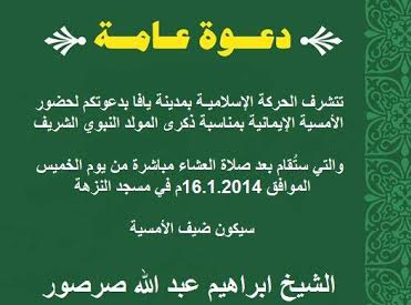 تتشرف الحركة الإسلامية بمدينة يافا بدعوتكم لحضور الأمسية الإيمانية بمناسبة حلول ذكرى المولد النبوي الشريف والتي ستُقام يوم الخميس القادم الموافق 16.1.2014م بعد صلاة العشاء مباشرة في مسجد النزهة.