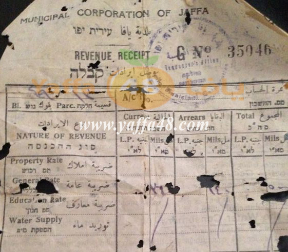 وينشر موقع يافا 48 فاتورة صادرة عن بلدية يافا بتاريخ 1-2-1948 أي قبل نحو 3 أشهر من سقوط المدينة، وهي عبارة عن وصل ايرادات بقيمة 500 مل فلسطيني صادرة بحق أحد سكان المدينة "الاسم محفوظ في هيئة التحرير" كضريبة منازل.