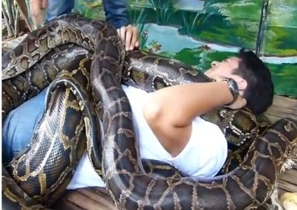 في بادرة غريبة من نوعها أطلقت حديقة حيوان في الفلبين خدمة مساج غير معتادة لزوارها، حيث يرقد الزوار تحت رحمة عضلات ثعابين "البايثون" البورمية الضخمة، والتي تعتبر من أخطر الثعابين المميتة في العالم.