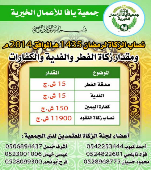 جمعية يافا للأعمال الخيرية: الإعلان عن نصاب الزكاة للعام 1435هـ