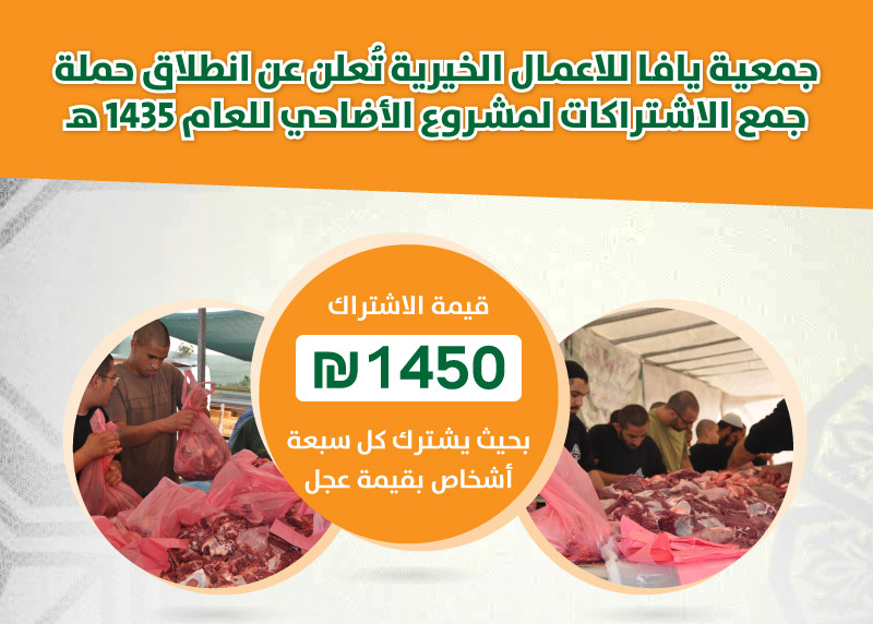 تدعو جمعية يافا للأعمال الخيرية الأهالي في مدينة يافا للمشاركة والتسجيل في مشروع الأضاحي للعام الجاري 2014-1435 هـ، حيث سيشترك كل سبعة أشخاص بقيمة عجل، كل شخص بمبلغ 1450 شيكل فقط.