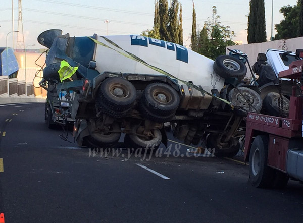 بالصور: اصابة طفيفة لسائق بانقلاب خلاط باطون قرب مدينة يافا