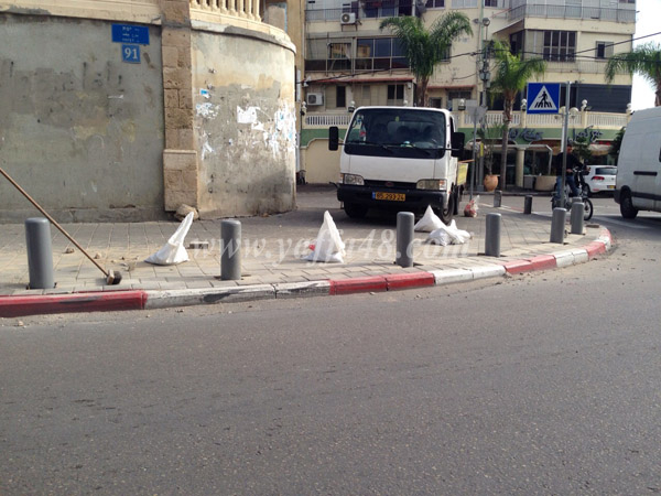 بالصور: البلدية تباشر بترميم أعمدة الرصيف في شارع ييفت بعد تضررها بحادث طرق