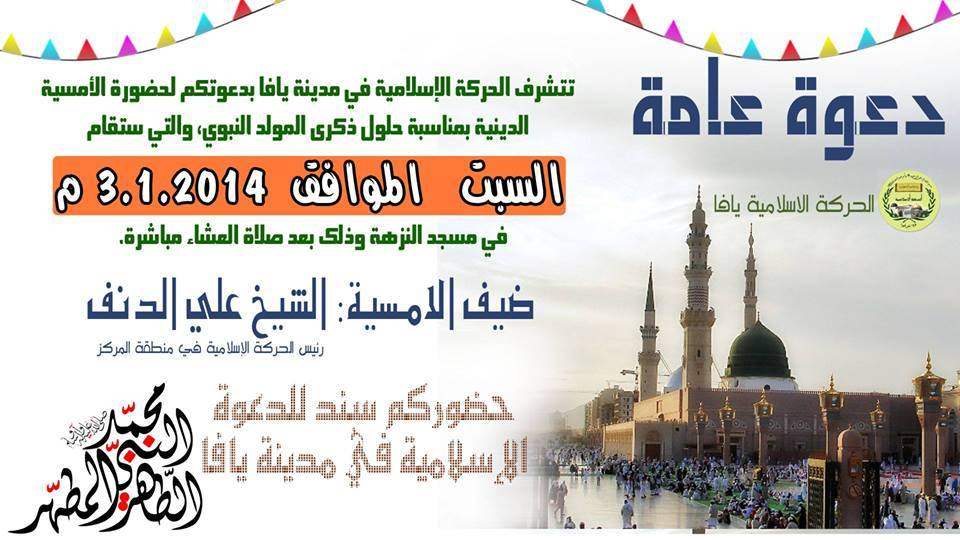 تتشرف الحركة الاسلامية في مدينة يافا بدعوتكم لحضور الامسية الدينية بمناسبة حلول ذكرى المولد النبوي الشريف والتي ستُقام اليوم السبت في مسجد النزهة بعد صلاة العشاء مباشرة.