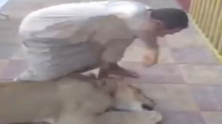 انتشر فيديو التقط في حديقة حيوانات عربية يوثق قيام شاب بتوجيه لكمات متتالية لرأس أسد مكبل بالسلاسل، إذ بدا "ملك الغابة" عاجزا عن الدفاع عن نفسه أمام مهاجمه.