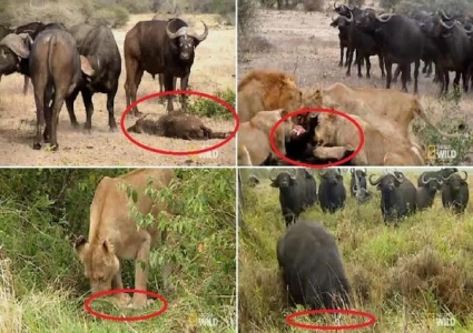 وفي اللحظة التي أدركت فيها اللبؤة الأم ما يحدث، كانت الجواميس تدهس ثلاثة أشبال، بينما تقترب اللبؤة الأم مرعوبة على أطفالها، لكن الجاموس يتصدى لها ليزيد آلامها، وخاصة حين نادت على الصغار فجاء الرد من سبعة فقط، لنشاهدها وهي تقلب جسد أحد صغارها وقد ضربها الحزن في مقتل، نفس الحزن الذي ضرب قطيع الجاموس البري وهو ينظر إلى صغيره.