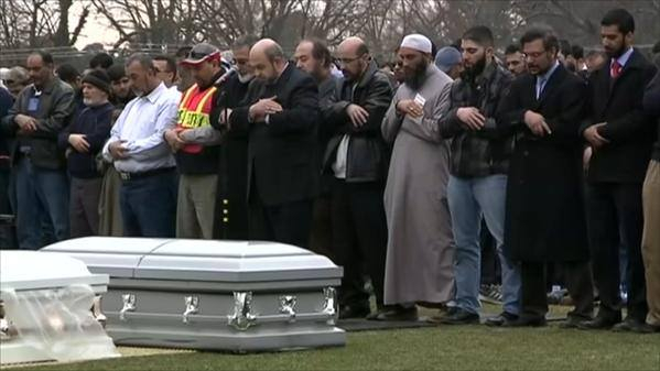 وتم جلب جثامين الضحايا الثلاثة، وهم شادي بركات (23 عاما)، وزوجته يسر محمد أبو صالحة (21 عاما)، وشقيقتها رزان محمد أبو صالحة (19 عاما) ظهر الخميس إلى مسجد جمعية "رالي" الإسلامية في مدينة "تشابل هيل" بولاية كارولينا الشمالية، حيث تم استقبالها بدموع منهمرة من قبل أصدقائهم وذويهم الذين كانوا ينتظرون في حديقة ووريت فيها الجثامين.