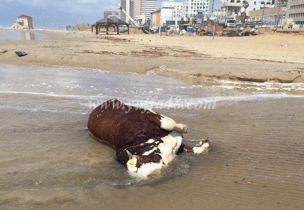بالصور: البحر يقذف ببقرة على الشاطئ شمال مدينة يافا
