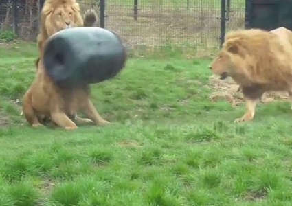 عانى أسد طماع بحديقة حيوان هولندية عندما انحشرت رأسه في برميل الطعام، ما جعله يدور الحديقة وهو في حالة هياج، حتى تدخل العاملون.