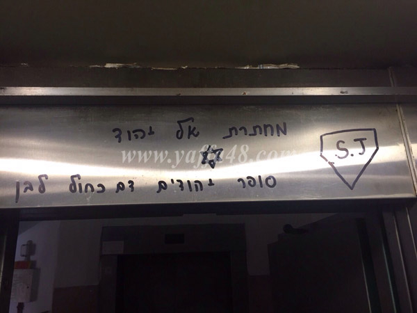 استفاق سكان بناية في مدينة يافا يسكنها عائلات عربية ويهودية بشكل مشترك على كتابات عنصرية داخل المصعد محرضة "الموت للعرب". وتم التوقيع على الشعار باسم "عصابة اليهود – قوة جديدة في يافا مع شعار نجمة داوود.