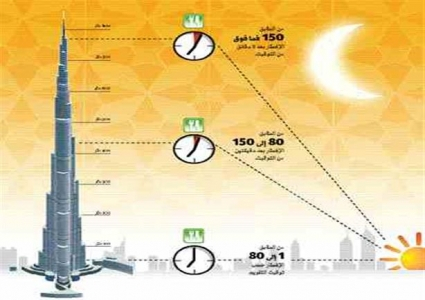 وأشارت الشعبة إلى أن سكان الطوابق من 150 وما فوقها، يحل عليهم موعد أذان صلاتي المغرب والعشاء متأخراً بثلاث دقائق، فيما يحل أذان صلاة الفجر عليهم مبكراً بثلاث دقائق، أما سكان الطوابق الأقل من الطابق الـ80 فيفطرون وفق موعد أذان المغرب في المساجد.