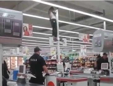 قام سارق بمحاولة غبية لتسلق عمود الضوء والتشبث بأحد المصابيح في أحد المتاجر، في محاولة للهروب من رجال الشرطة.