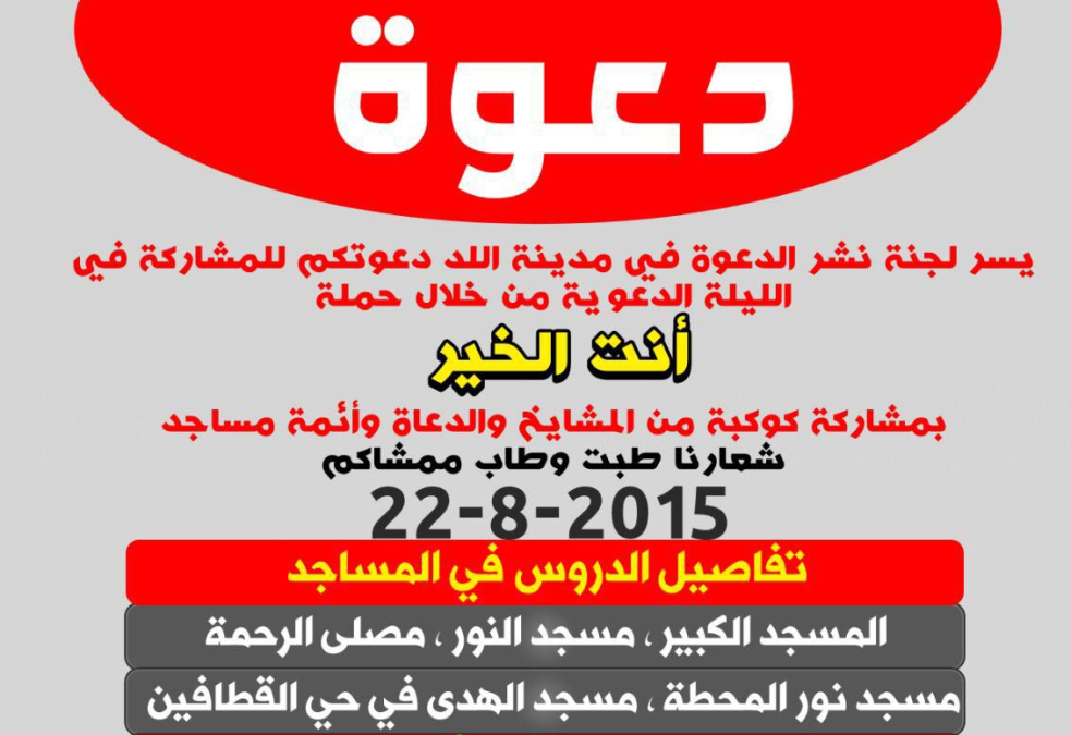 يسر لجنة نشر الدعوة في مدينة اللد دعوة الأهالي للمشاركة في الليلة الدعوية من خلال حملة "انت الخير" والتي ستُقام السبت 22-8-2015.
