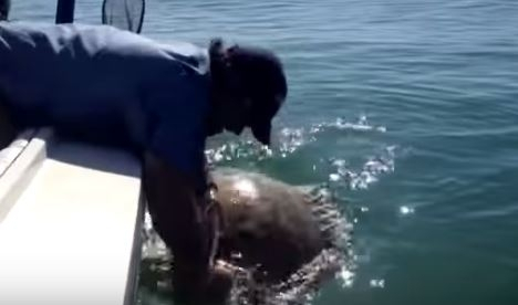 انتقمت سمكة ضخمة من رجل قام بصيدها بتوجيه صفعة قوية من ذيلها نحو وجهه أفقدته توازنه بعض الشيء وتسببت في سقوط قبعته بالماء.