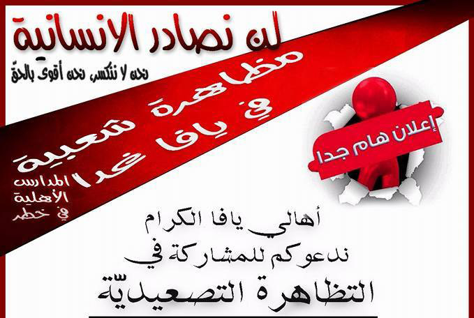 دعا أولياء الأمور في المدارس الأهلية في يافا إلى تظاهرة ومسيرة حاشدة اليوم لدعم نضال المدارس الأهلية ضد سياسات الحكومة العنصريّة، حيث سيتم التجمع اليوم الخميس في الساعة الخامسة مساءً في ساحة كنيسة الخضر القائمة في شارع لوي باستير، وستنطلق المسيرة باتجاه برج الساعة مطالبةً الحكومة بالاستجابة الفورية للمطالب العادلة للمدارس الأهلية لكي يتمكن الطلاب من العودة إلى مدارسهم وحياتهم الطبيعية.
